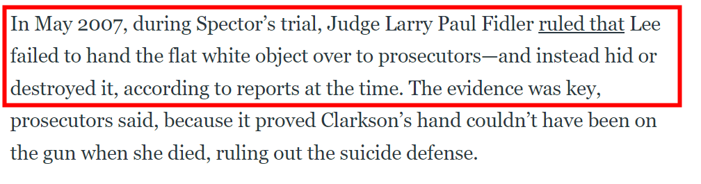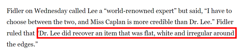 2007 年 5 月,在斯佩克特的审判中,法官拉里·保罗·菲德勒 (Larry Paul Fidler)裁定李昌钰确实收走了一件扁平、白色且边缘不规则的物品。