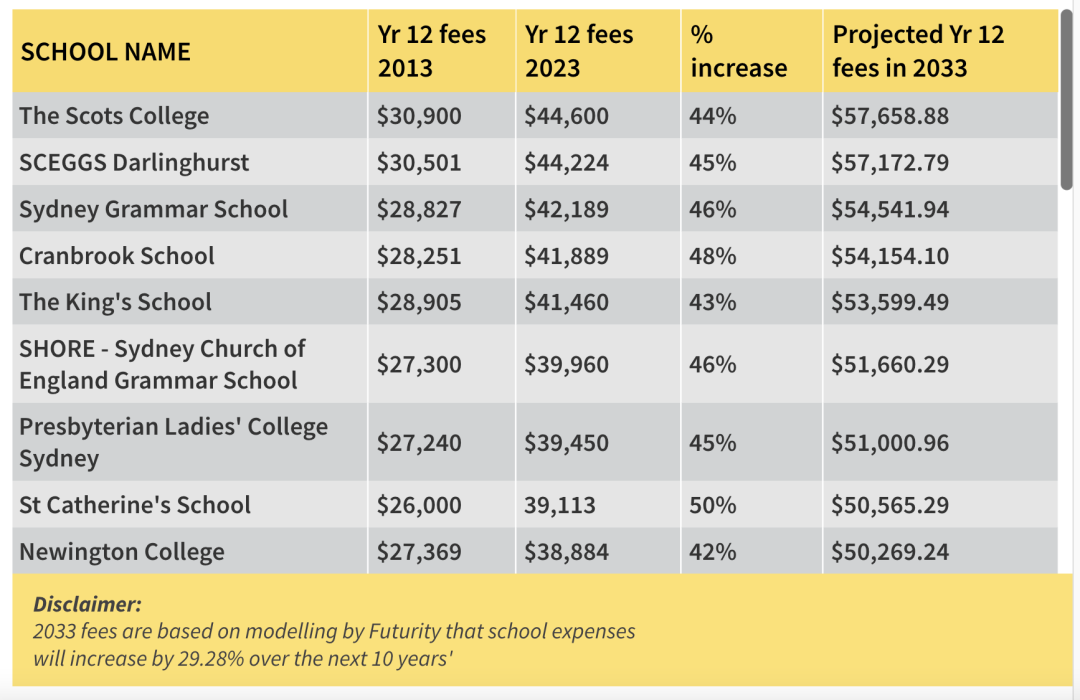 2013 年 6 月至 2023 年 6 月期间,悉尼的消费价格指数上涨了 30%,但在此期间,The Scots College和SCEGGS Darlinghurst 12 年级学费分别上涨了 44% 和 45%。