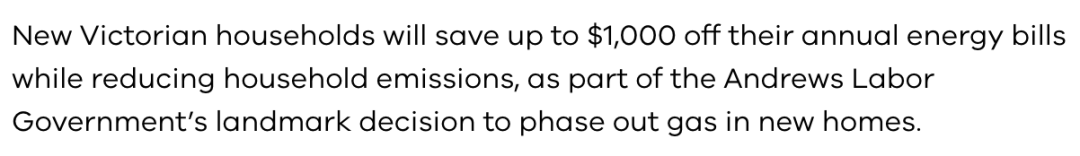 州长表示,维州政府将逐步淘汰住宅天然气供给,这将是一个里程碑式的决定,维州家庭拥有的新家每年将可节省高达1000澳币的能源费用,同时减少家庭的碳排放。