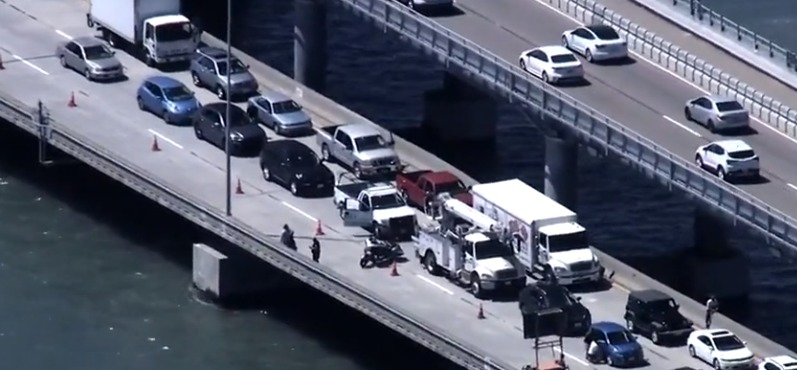 周二下午4 点 40分左右,警方接到报告称一名司机在海湾大桥上鲁莽驾驶,十分不正常,并且怀疑该名司机持有枪支。
