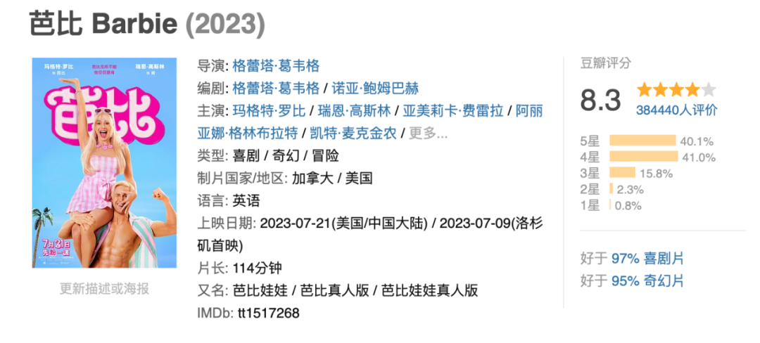 票房亮眼,评价同样不俗。《芭比》猫眼购票9.2分,向来毒舌辣评的三十多万豆瓣网友集体打出8.3高分。