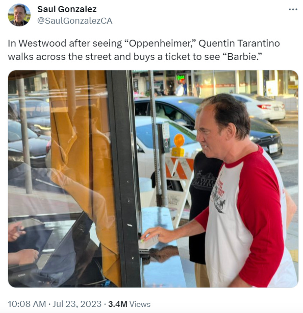 比如大导演昆汀,他看完《奥本海默》就火急火燎跑到隔壁买票看《芭比》。