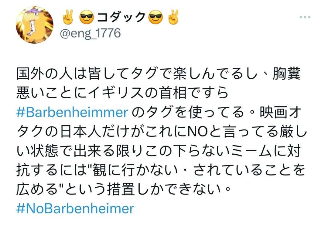 “外国人很喜欢# Barbenheimmer,更令人尴尬的是,就连现任英国首相都使用了这个标签。放眼全世界,就只有日本电影御宅族对此说不。而对抗这种愚蠢标签的唯一方法就是在这种艰难的环境下、尽可能地‘不去看、不去传播’。”