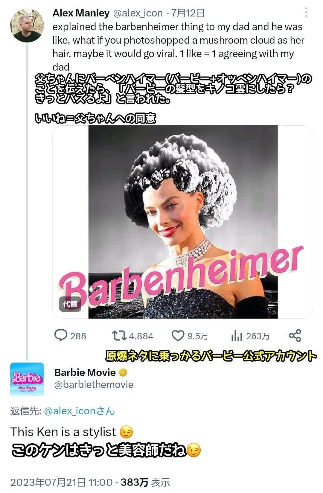 这次让日本人破防的原因在于,《芭比》官方账号多次拿“蘑菇云”和“原子弹爆炸”来玩梗。