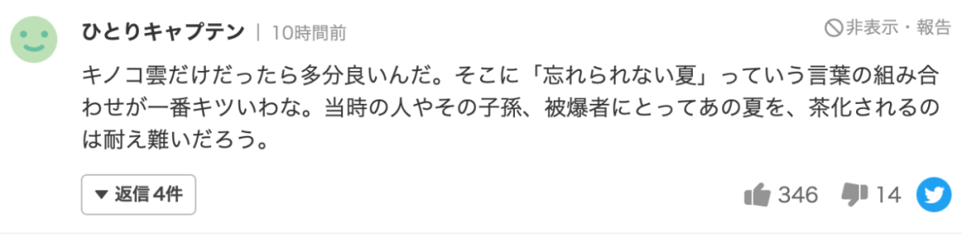 “如果只有蘑菇云的话,那大概没什么大不了。但是在这种图片上附上‘令人难忘的夏天’的文案,实在是太过分了。对于当年那些遭受原子弹轰炸的人以及他们的子孙而言,那个夏天是相当难以忍受的吧。”