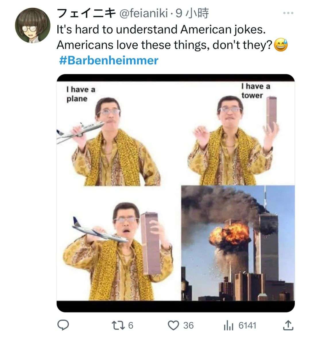看到这,日本人彻底怒了,认为《芭比》玩梗彻底冒犯了日本。有日本人怒怼,就你们美国人不能拿这个当作梗开玩笑,毕竟当年就是美国人向广岛和长崎投放了原子弹。
