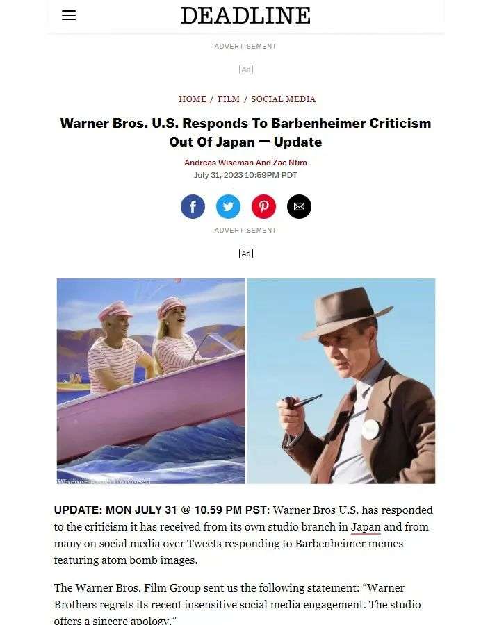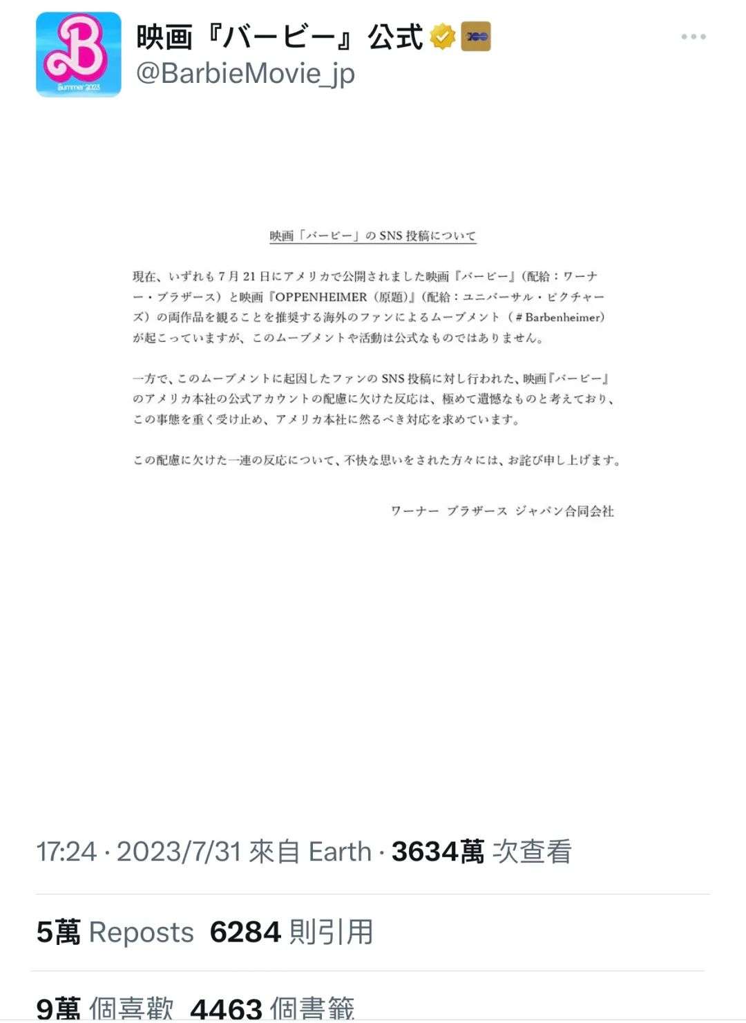 “为了宣传观影,粉丝自主发起了#Barbenheimer宣传活动。此活动并非为官方性质。我们对美国总部这次欠缺考虑的做法表示极为遗憾,我们意识到事态的严重性,已敦促美国总部尽快做出适当的应对措施,向所有对此感到不适的人深表歉意。”
