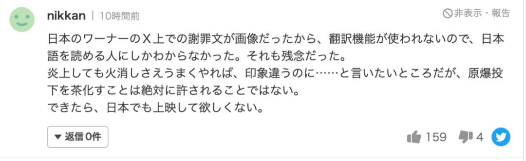 “日本分公司上的道歉文是图片,不能使用翻译功能,因此只有懂日语的人才明白,实在是太失望了。如今已经闹出火来,即便顺利灭火解决事情,大家对此的印象也会有所不同。我想说的是,绝对不能拿原子弹来玩梗。如果可以的话,我不想这部电影在日本上映。”