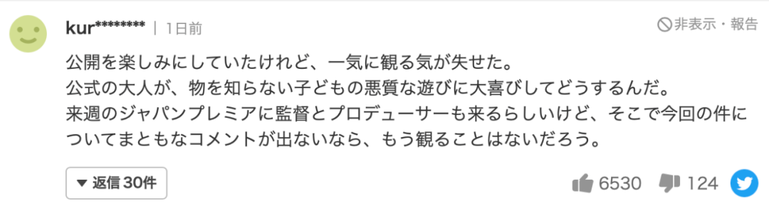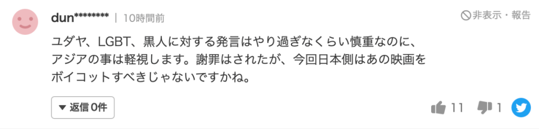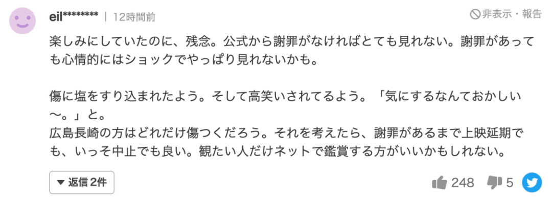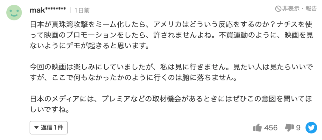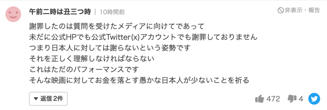 “美国那边的道歉仅仅是面对提问他们的媒体回答的,现在他们的官方账号都没有道歉。也就是说,我们必须正确意识到,他们美国人对日本人丝毫没抱有道歉的态度。这只是他们的一个敷衍的套路。希望接下来花钱去看这种电影的日本人能少一些。”