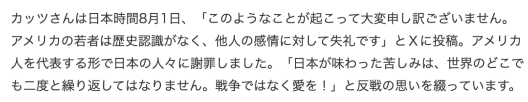 “发生这样的事情非常抱歉,美国的年轻人不懂历史,因此会冒犯了他人。希望日本曾经尝到的痛苦,不会在世界任何地方重演。不要战争,要爱!”