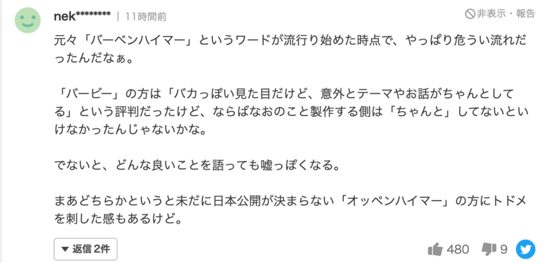 “一开始流行‘#Barbenheimer’的时候,我预感不妙,这果然是很危险的潮流。很多人评价《芭比》,即便乍眼看过去很傻,但出乎意料的是电影的主题和故事都很精彩,那么电影制作方更应好好宣传吧。不然的话,无论说什么漂亮的话都会变得像谎言那样。不管怎么样说,这对尚未在日本定档的《奥本海默》而言,有种被背刺的感觉。”