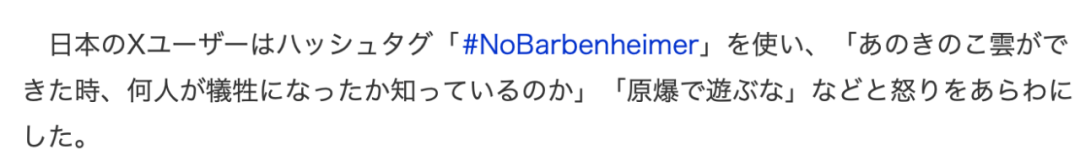 于是,日本人发起#NoBarbenheimer抗议,他们群情激愤,抵制过度玩梗,表示“那个蘑菇云形成的时候,牺牲了多少人命”、“请不要随便拿原子弹来玩梗”。