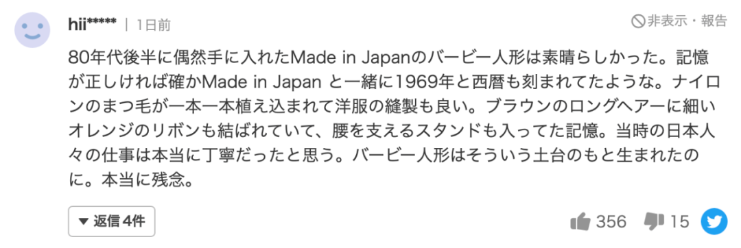 “在上世纪80年代后期我偶然得到了一个日本制的芭比娃娃,她很漂亮。如果我没记错的话,这个芭比娃娃身上还清晰印刻着日本制、1969年的字样,她那尼龙制的睫毛根根分明,身上的洋装也缝制得很好。我记得她棕色头发上还系着浅橙色的丝带,还有支撑身体的看台,非常精致。当时我觉得,日本人工作很仔细。芭比娃娃明明就是在这样的基础上诞生的,然而现在真让人失望。”