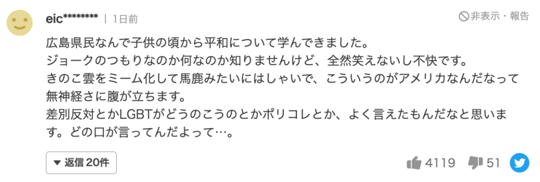 “如今广岛的人们可是从小就向往和平了啊。虽然我不知道这次是在玩梗还是想做什么,但真的一点都不好笑,让人很不舒服。把蘑菇云娱乐化、像傻瓜那样疯狂玩梗,这样的美国,神经迟钝得真叫人生气。这些美国人张嘴就是‘反对歧视’、‘LGBT’什么的,他们真的只剩一张嘴在叭叭。”