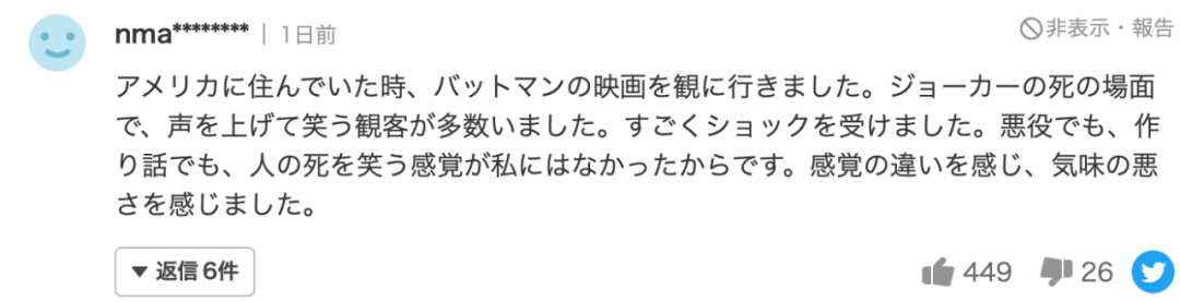 “我住在美国的时候, 曾经去看了蝙蝠侠的电影。在小丑死的时候,却有很多美国观众在放声大笑,我深受打击。即便是反派角色死亡,我从未产生过‘要去嘲笑别人死亡’的心情。我不懂,但我大受震撼,感到恶心以及来自人性的恶意。”
