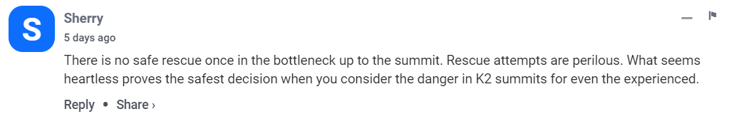 “一旦进入登顶瓶颈,就无法安全救援。救援尝试是危险的。当你考虑到K2峰顶峰的危险性时,即使对于经验丰富的人来说,看似无情的决定也是最安全的决定。”