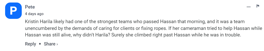 登山客拉克帕·夏尔巴 (Lakpa Sherpa) 当时也拍摄了一段在登顶的视频,他表示当时的确有一些登山者和雪巴人协作试图挽救哈桑的生命。