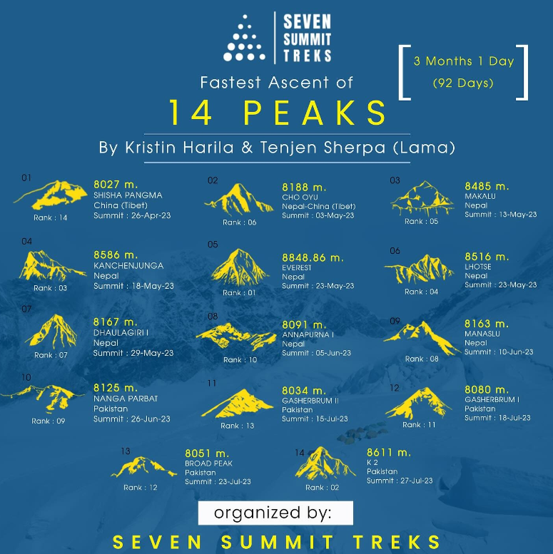的确,当天哈莉拉就打破了世界纪录。她在短短92天内就登上了14座8000米级数的高峰,打破此前189天的世界纪录。