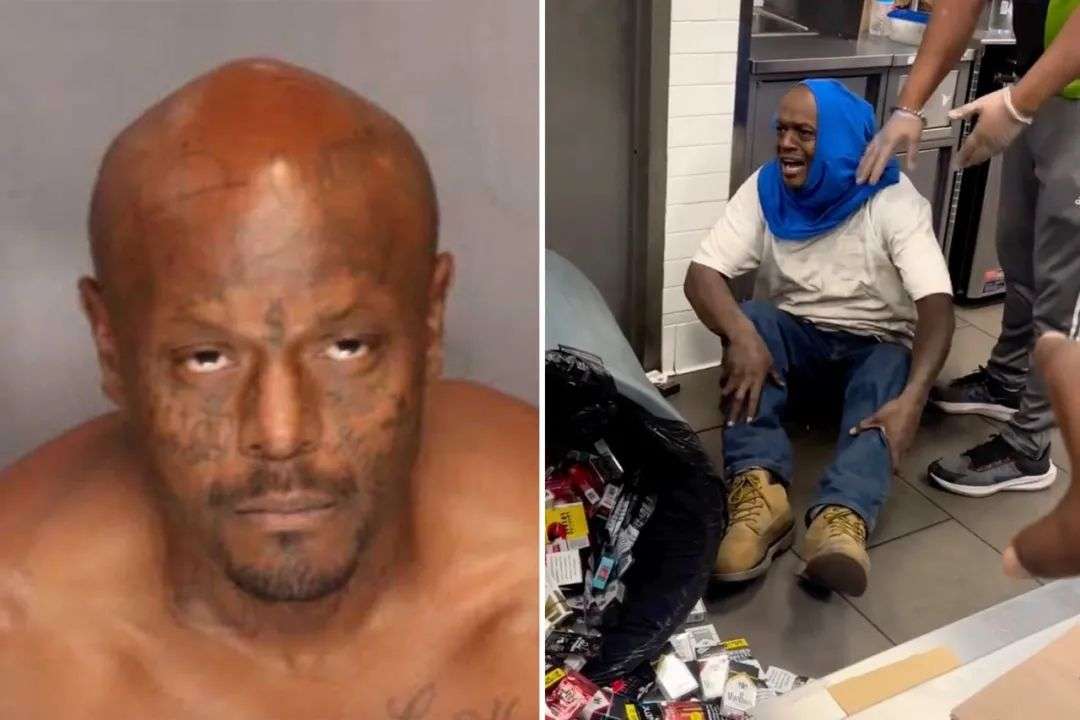 第二天(7月29日),也就是我们在视频中看到的情形,中午12点57分左右,弗雷泽再次来到该7-11便利店,再次威胁要开枪,这一次他带来了一个垃圾桶,将柜台上的香烟全部扫入垃圾桶里。