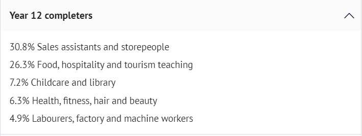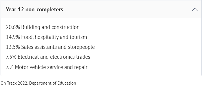 未完成学业者参加学徒或培训的比例保持稳定,而参加证书或文凭学习的人数略有下降,从2021年的15.6%降至2022年的12%。自2017年以来,12年级完成学业者和未完成学业者的主要工作岗位基本保持不变。