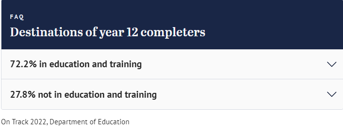 维州教育部在去年9月至11月期间调查了2021年21,428名12年级完成者,以及2021年1517名10、11或者12年级离开学校的学生(未完成学业的学生),样本包括 12,555 名女性、10,382 名男性和 62 名不认同男性或女性的受访者,追踪了他们的去年。