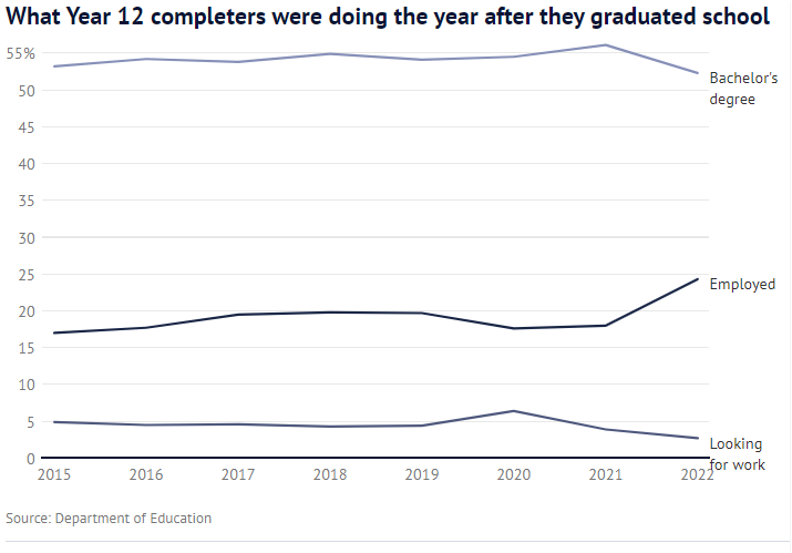 维州教育部在一份报告中称,学士学位入学率下降的部分原因是推迟深造的比例增加,在2021年达到7.5%的历史最低点后,2022年又回到了10.3%。