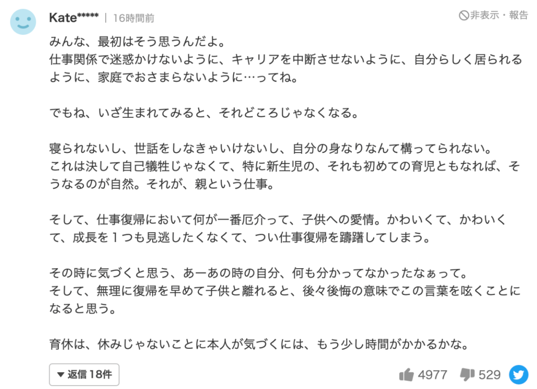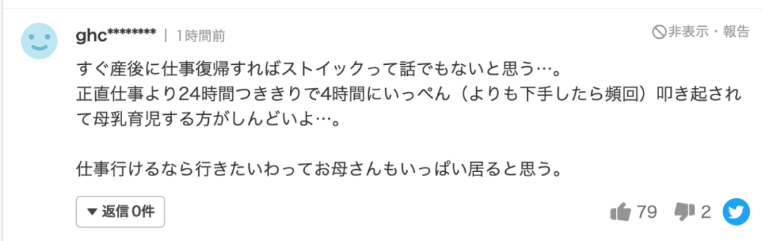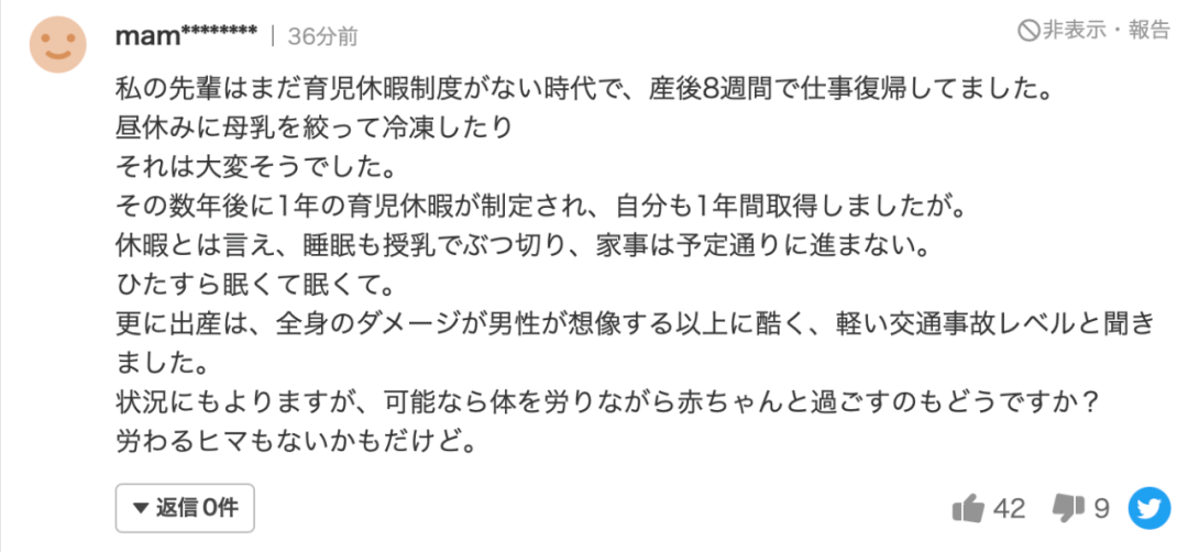 “我的前辈在那个还没有育儿假的时代,产后8周就重返职场了。她会在午休时挤母乳然后冷冻,看起来真的很辛苦。后来育儿假出来了,她自己也获得了一年育儿假。虽说是休假,但她经常睡不好,因为半夜总要起来给孩子喂奶,然后家务也不能按计划进行。而且听说生孩子的话,母亲身体所受到的伤害比男性想象的要严重不少,属于轻微交通事故水平。或许,生育、育儿就没有不辛苦的时候。”