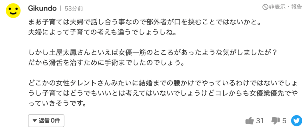 “话说育儿就是他们夫妻之间的事情啊,局外人插嘴不太好吧。不同的夫妻,育儿方式也有所不同。tao酱她作为一个女演员,曾经为了演戏而做了切舌手术。我并不认为她觉得育儿无所谓,只是她决定今后要优先以演员事业为重。”