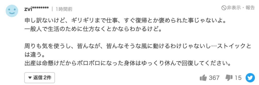 “对不起,这种工作到极限、生完孩子马上就工作的事情并不值得提倡,如果是普通人为了生活要赚钱那就没有办法了。这并非是自律的问题,而是生孩子就是拼过命的事情,因此请你好好休息、养好身体。”