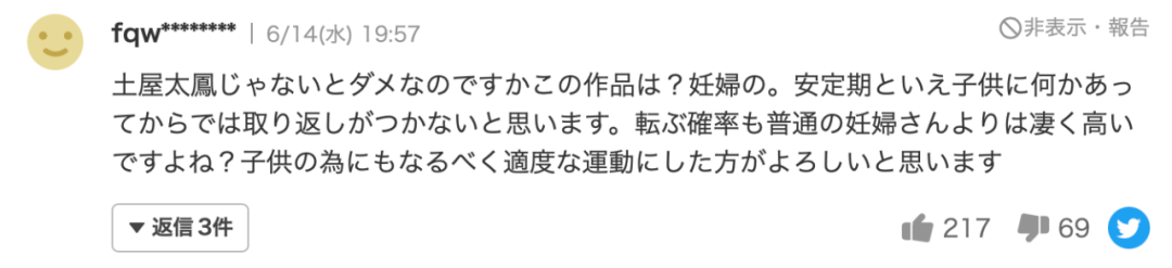 “这部舞台剧就是离开土屋太凤就演不下去了吗?作为孕妇,虽然是安稳期,但是如果发生什么事情的话是无法挽回的。她会摔倒的机率也比一般孕妇要高不少吧?我觉得为了孩子,就尽量做些适度的运动就好了。”