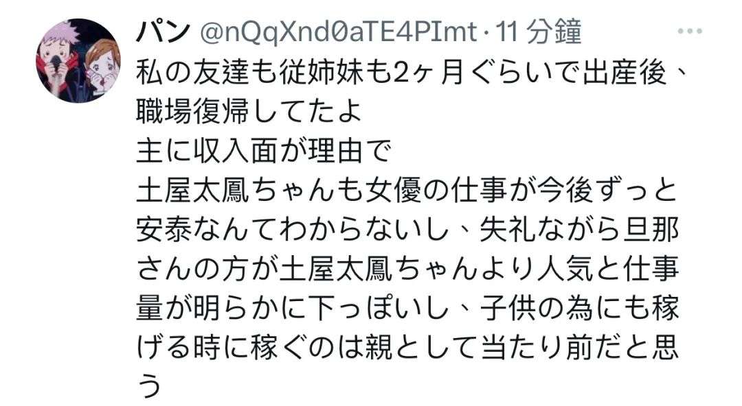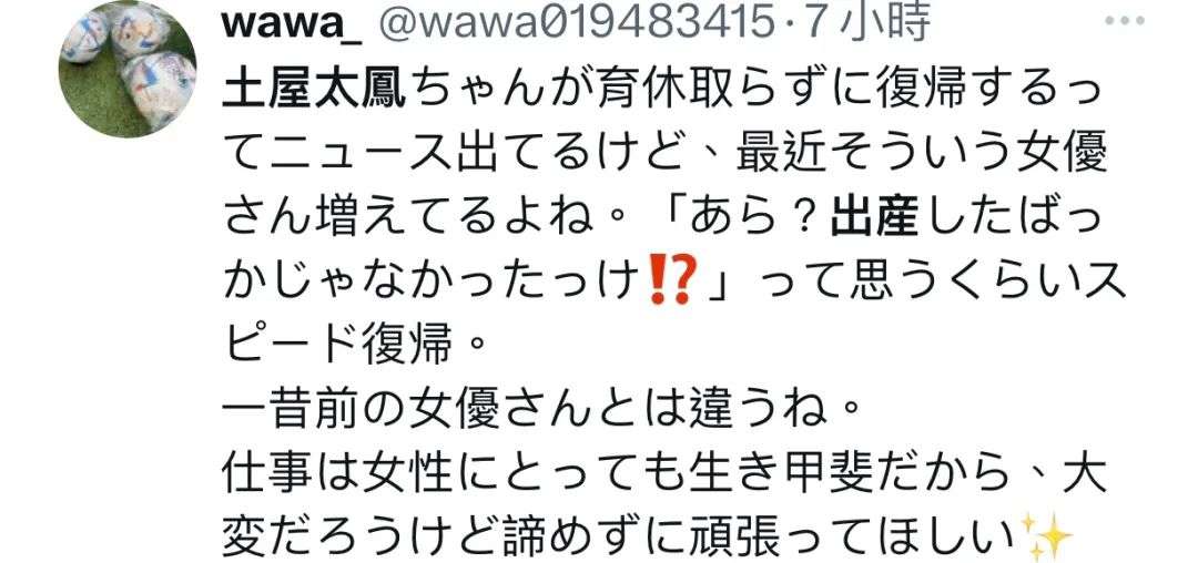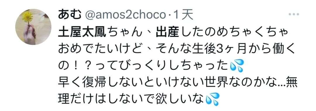 “土屋太凤生了小孩,我很高兴。不过她不休产假、产后三个月就要开工?我很惊讶。不知道这是否是一个‘一刻都不能停’的世界,我只是不想你勉强自己。”