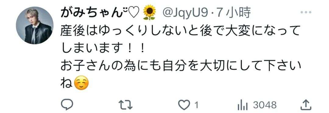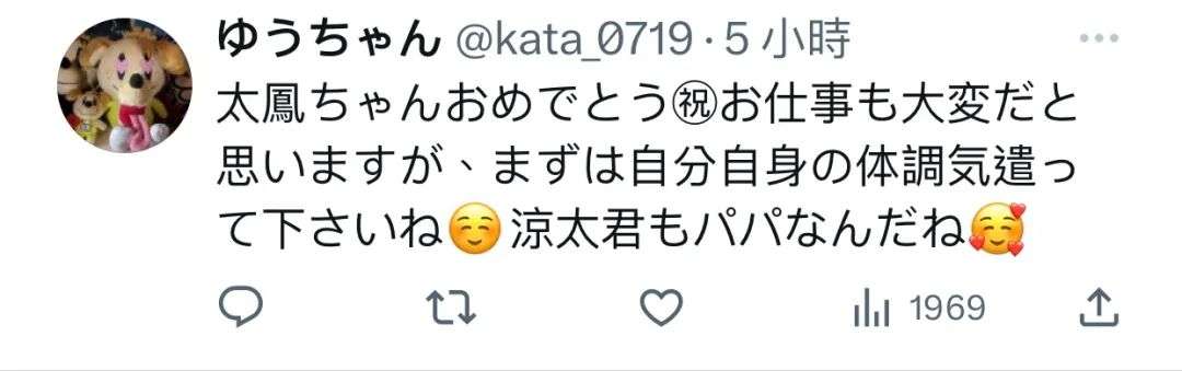 “恭喜tao酱,知道你工作很辛苦,但希望你先照顾好自己的身体。凉太现在也成为爸爸了啊。”