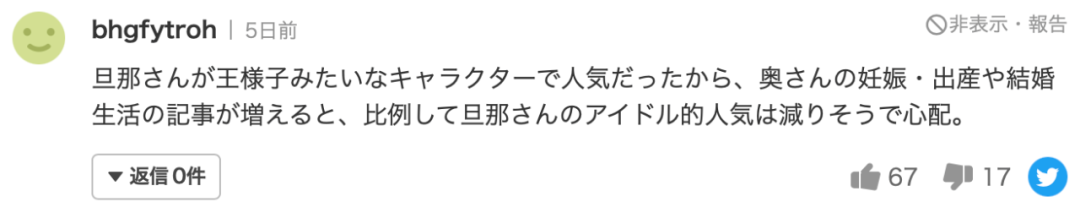 “她的丈夫是像王子那样受欢迎,因此妻子怀孕生子之类的报道增加的话,她丈夫作为爱豆的人气就会相应减少,真是令人担心啊。”
