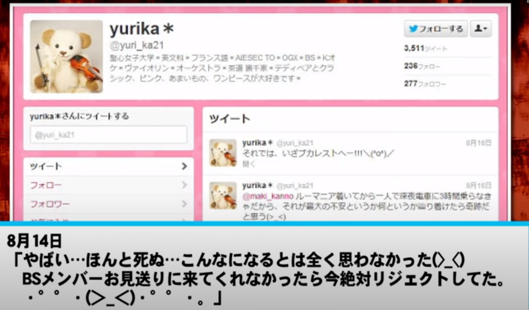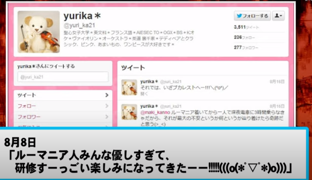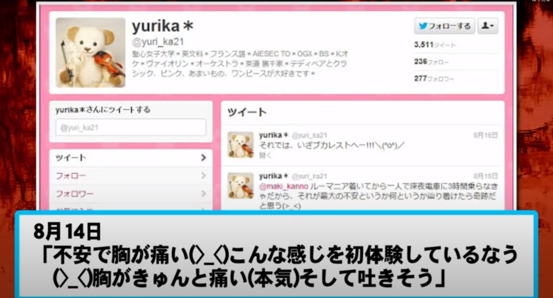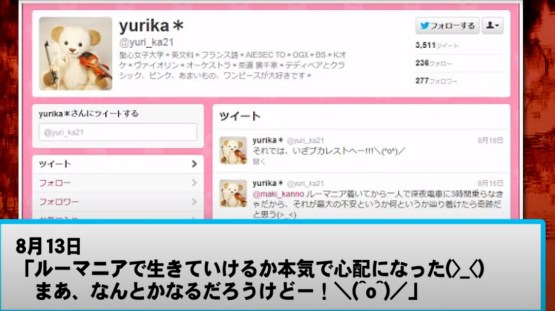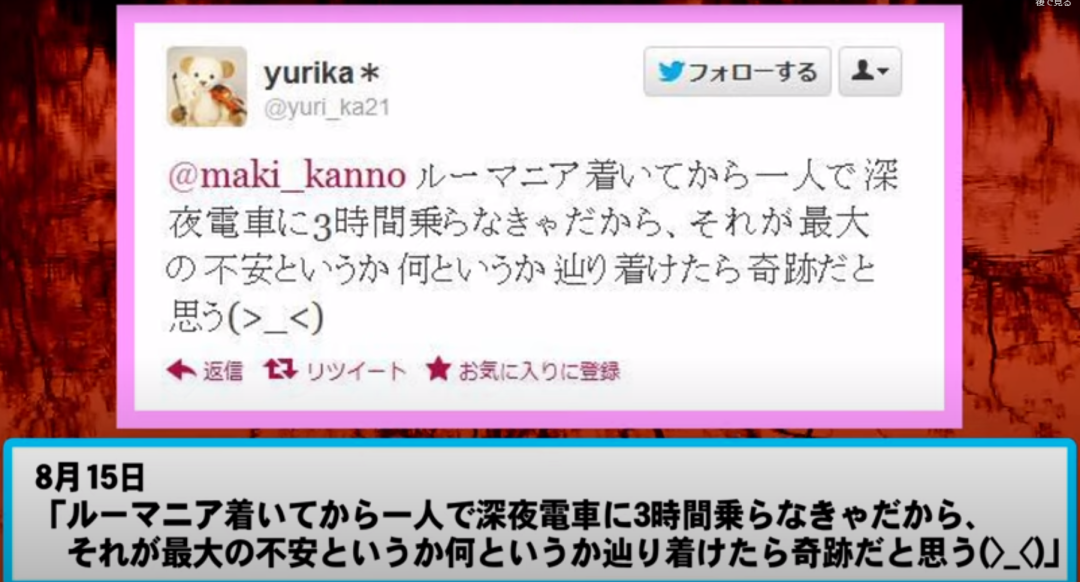 8月15日,友利香发出了她生命中最后一条信息。“到达罗马尼亚后需要一个人乘坐3小时的深夜电车,这是我最大的不安,如果这份最大的不安能顺利通过的话将是奇迹。”
