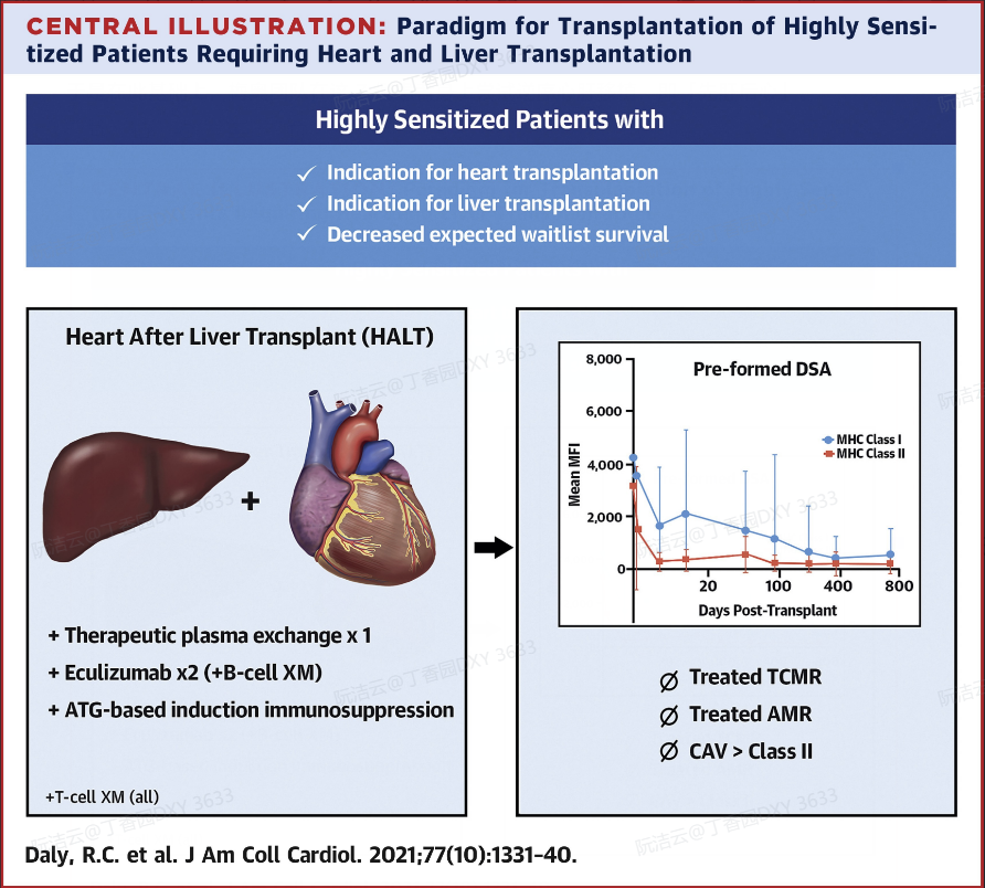 在标准诱导免疫抑制方案配合下,移植均获成功,未出现心脏同种异体移植物的超急性排异反应,术后没有持续的移植功能障碍,回顾性交叉配型(B 细胞和 T 细胞,ProFXM)全部变为阴性,DSA MFI 水平明显降低(均 < 2000)。