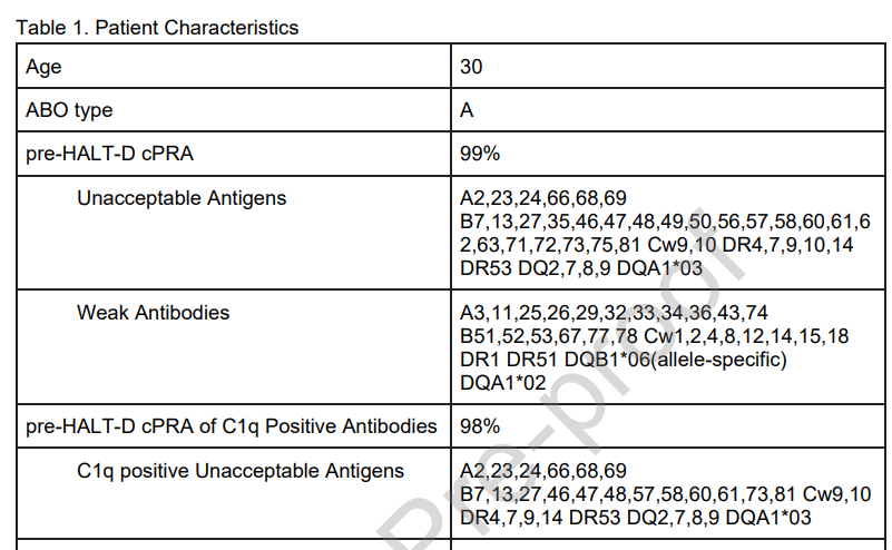 免疫相容性检测提示:前瞻性流式细胞术 B 细胞和 T 细胞交叉配型 (ProFXM)均为阳性;平均计算组合反应抗体(cPRA)为 75%;DSA MFI 均大于 4,000 的阈值。以上结果均提示他们有更高的排异风险、配型难度极高需要漫长的等待时间。