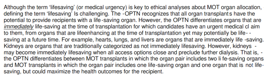 尽管「救命」(即医疗紧急性)一词是 MOT 器官分配伦理分析的关键,但如何定义「救命」一词具有挑战性——所有器官移植,都有潜力挽救受者生命。