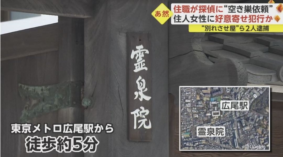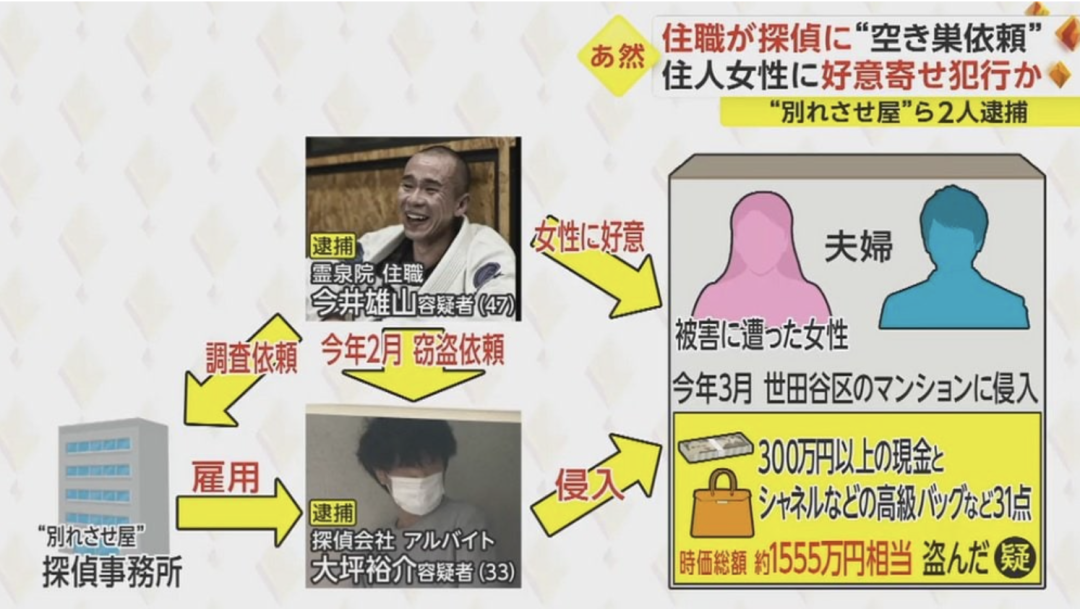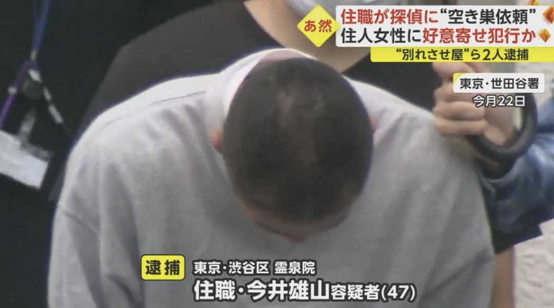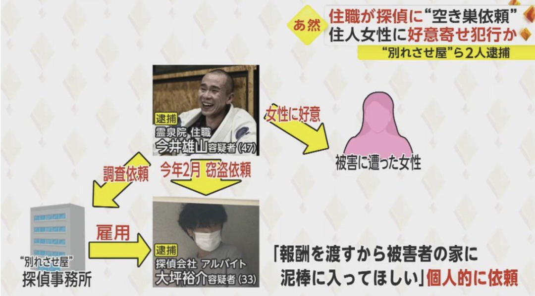 该案件的犯罪嫌疑人交代说一切都是受今井住持的指使。今井曾要求一家自称是所谓“独立商店”的侦探机构对自己心仪的女子进行调查。
