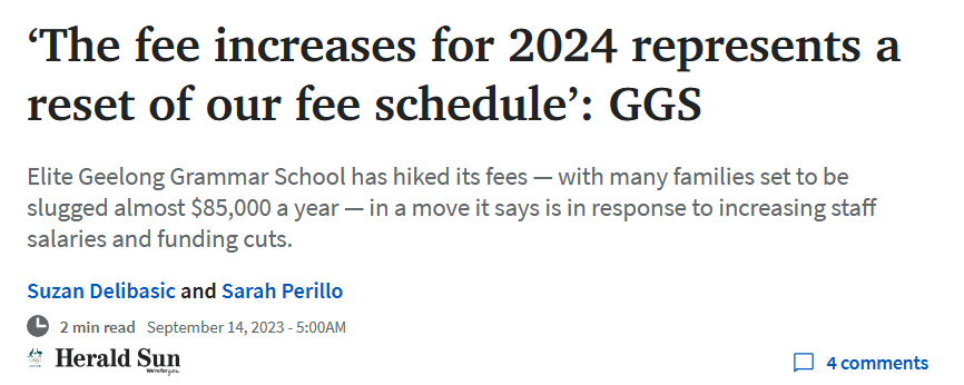 随着Geelong Grammar打响了2024年学费大幅上涨的第一枪,其他私校FOLLOW UP的可能将大大提高...