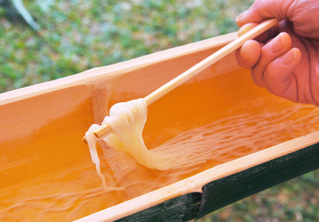 在这里,游客可以一边眺望瀑布的美景,一边品尝用泉水制作的 "流水素面"。