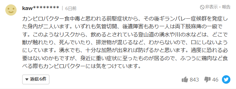 我认识的两个身边的人,他们的前驱症状被认为是弯曲杆菌食物中毒,然后患上了格林-巴利症候群综合症。这两个人都做了气管切开术,落下了终身残疾,其中一个还是双下肢瘫痪的一级截瘫患者。由于存在这些风险,我从不喝山路上本应可以饮用的泉水或河水,因为我不知道动物可能在哪里接触过泉水或河水,或死在里面,或与排泄物混在一起。即使是泉水,如果经过充分加热,也可以预防细菌进行正常饮用。也许没有必要过分害怕弯曲杆菌,但我即使吃鸡肉也要小心弯曲杆菌,因为我身边有人曾出现过严重的症状。