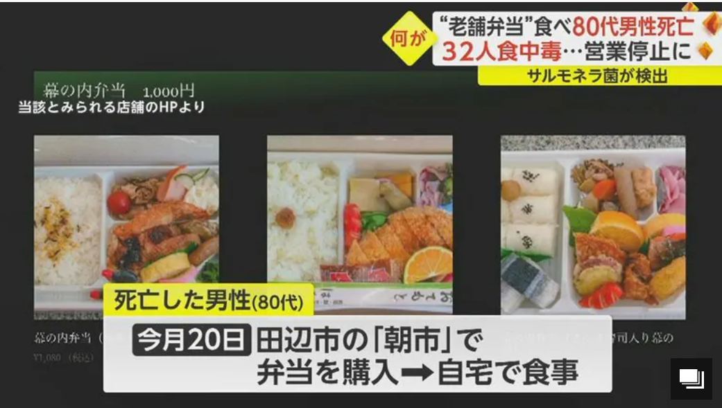 而进入今年夏天之后,日本像这样的集体食物中毒事件只增不减。8月22日,和歌山县一名80多岁的老人因购买了一家老字号餐厅的便当食用后,出现了发热、腹痛和拉肚子的症状,最终不治身亡。