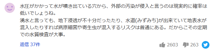 在水压作用下,外部污染从涌水孔进入的现实可能性可能很低。不过即使是山泉水,如果地下渗透不足,或者由于供水系统(水道)的建设而混入地表水,也有可能引入病原菌和寄生虫。因此,定期进行水质检测非常重要。