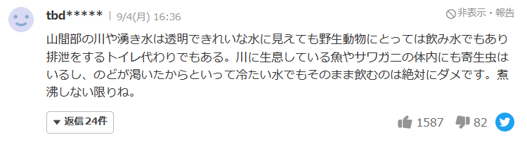 山间的河流和泉水看似清澈干净,但对于野生动物来说,它们既是饮用水,也是排泄的厕所。生活在河流中的鱼类和河蟹体内也有寄生虫。除非你把它煮沸。