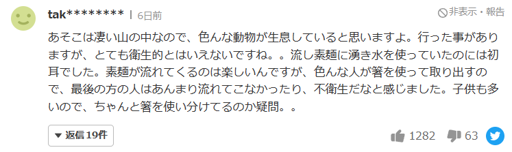 这里位于一座大山的中间,所以我认为那里居住着各种各样的动物。我去过这家店,看起来并不太卫生。我从来没听说过流水素面用的是山泉水。虽然看着面条流淌的样子很有趣,但很多人都用筷子夹面,所以坐在最后的人面流得并不太顺畅,我觉得很不卫生。而且这里有很多孩子也在体验,不知道他们是否会正确使用筷子。