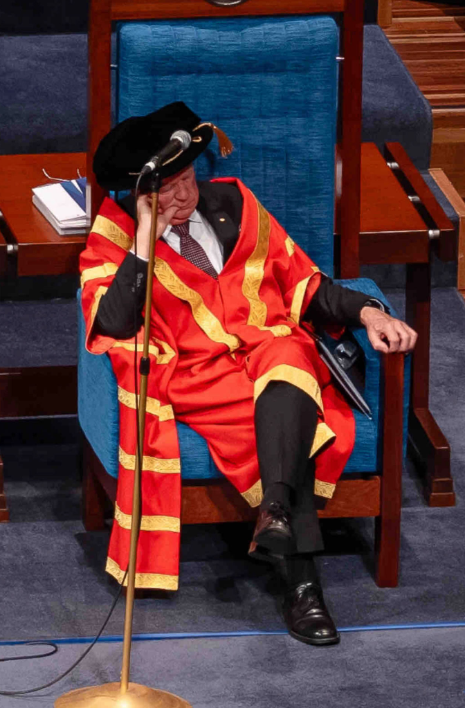 乍一看没什么问题,但仔细看看,莫纳什大学的校长在毕业典礼上双目紧闭,摆出一个舒服的姿势靠在椅子上睡着了...