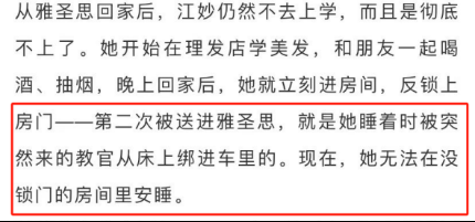 而他们将学生带去学校的方式也相当暴力,比如小江,就曾在睡梦中突然被闯进家门的教官们绑住,丢进车里,一路送进了“雅圣思”。