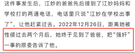 直到距离她被性侵过去两个月,甚至一度想到过轻生之后,她才终于见到了父亲,得以把“强奸”一事的原委告诉了家人。
