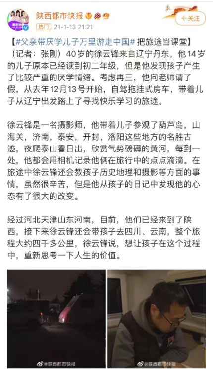 一位40多岁的父亲,在发现14岁的儿子厌学,且沟通受阻的情况下,决定放下自己的事业,陪伴儿子休学半年,进行了一场跨越大半个中国的“心灵之旅”。