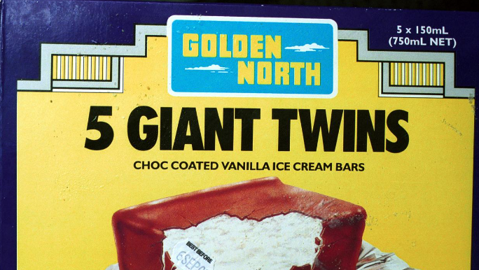 根据官方历史,Golden North 是第一家生产半加仑 (2L) 容器冰淇淋的制造商,于 1940 年推出该产品。Golden North 生产一系列不同的冰淇淋,但因其标志性的 Giant Twins 冰淇淋棒而深受人们喜爱。